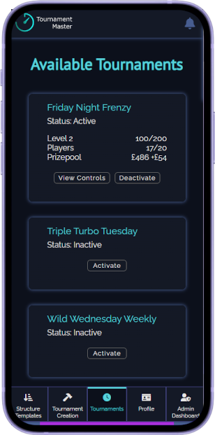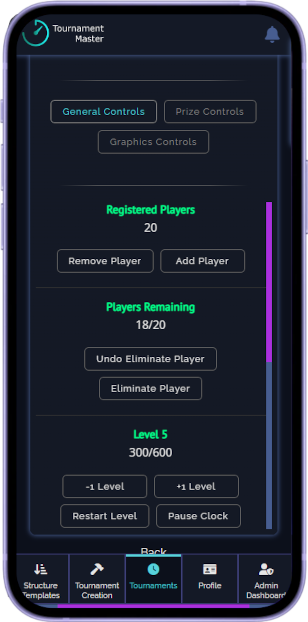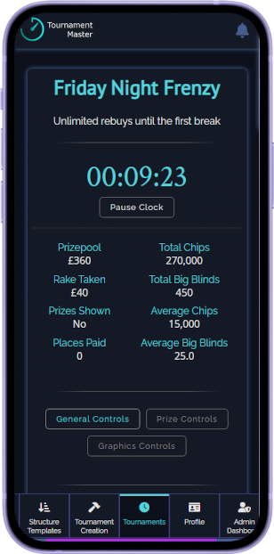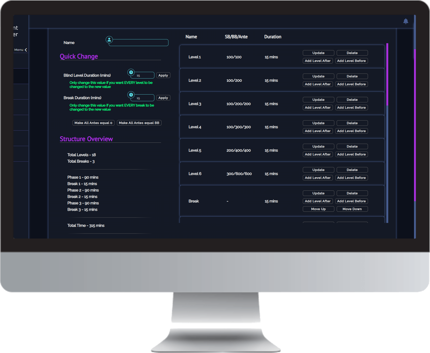 You will have full access to the blind structure of your tournaments, right down to individually setting the duration of each level if you wanted to.
